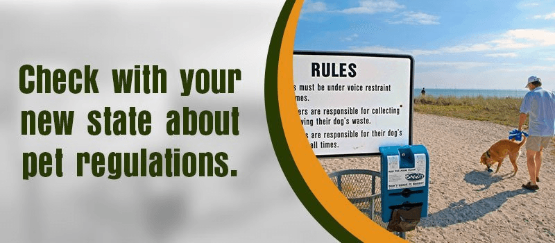 Before moving to a new state/province with your pet, keep in mind the local leash laws, pet ordinances, and pet licensing requirements. You may visit the website of the U.S. Department of Agriculture or the State Veterinarian's office in your destination state if you have any questions and to get more details on how to coordinate the move for your pet. For local ordinances, you can also contact the City Clerk’s office, local organizations, or animal control facility in the area where you’ll be moving.While requirements and deadlines vary depending on the state, many states or provinces require owners to register their pets within a month of acquiring the pet or moving to ensure that animals receive their necessary rabies shots for public safety purposes. And if what you have are unusual or exotic pets, such as a snake or a monkey, it’s all the more reason to check out the local laws first as not all states accept them.